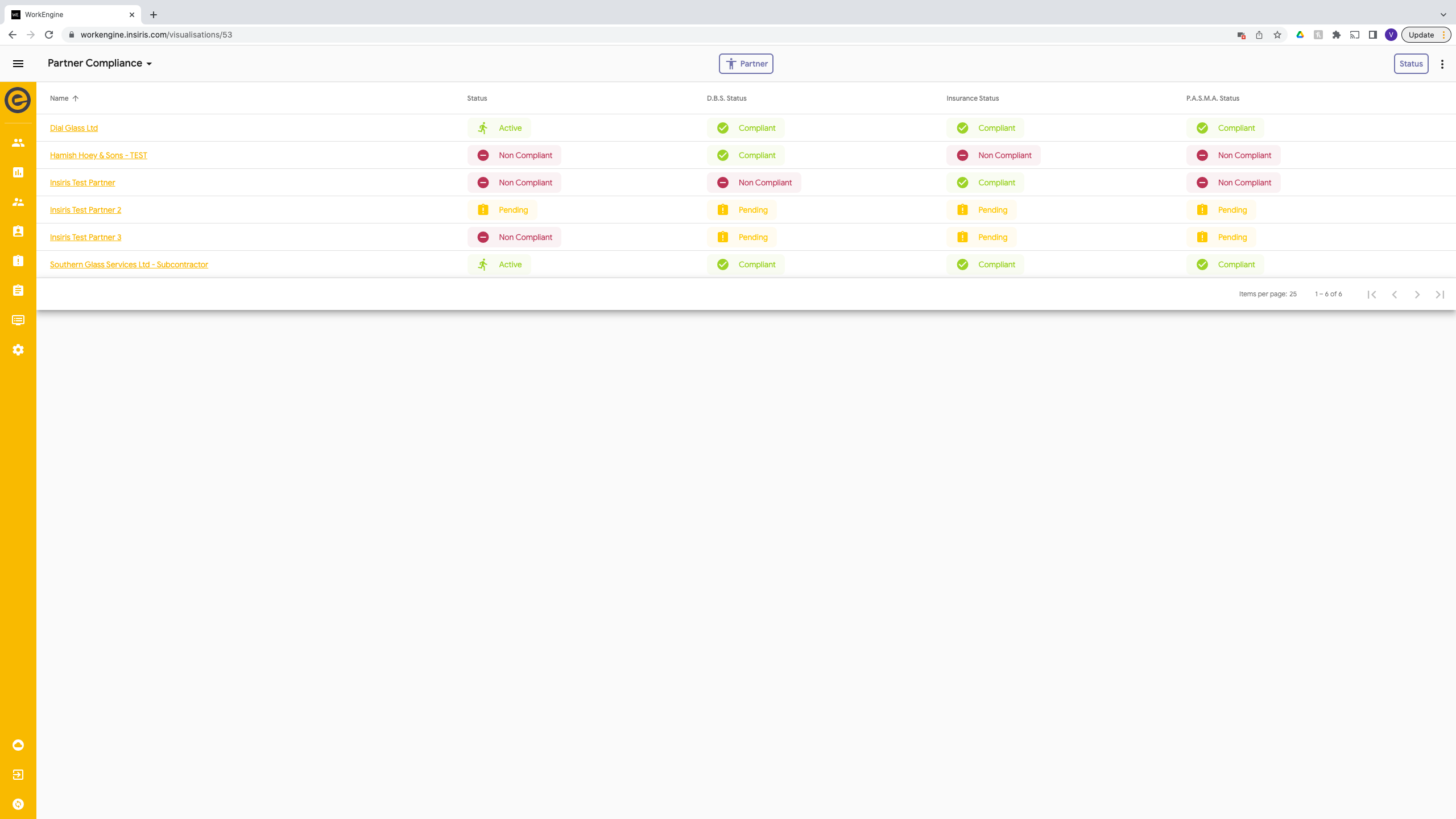 The compliance table shows you a list of partners with a column for each compliance status. These are sorted by name ascending. If you want to filter you can filter by Partner Status.
